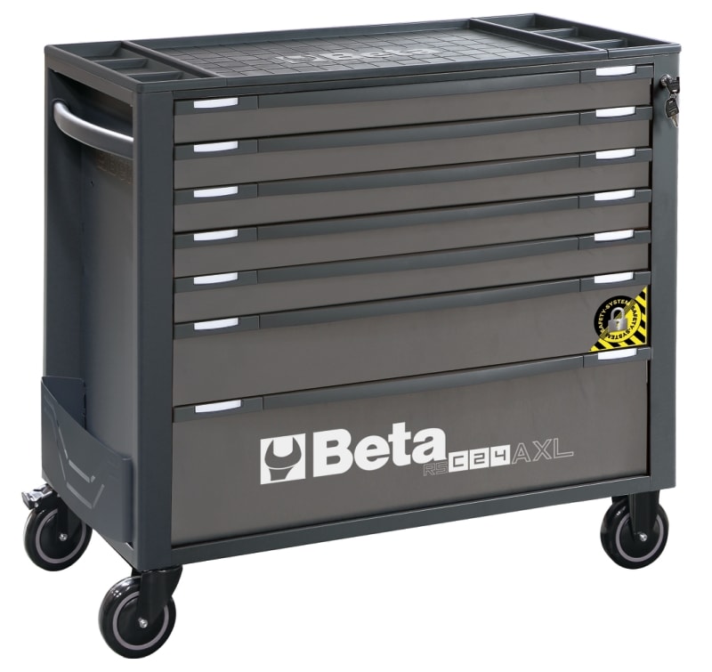 Cassettiera porta attrezzi 7 cassetti, con sistema antiribaltamento, modello lungo Caratteristiche principali: ? Nuovo piano di lavoro rinforzato in ABS con bordi anticaduta, otto fori per l'alloggiamento dei giravite e 6 vaschette portaminuterie ? Frontalino in nylon ad alta resistenza, con porta-etichette integrato ? Piano dei cassetti protetto da tappetini di gomma espansa ? Quattro ruote ? 125 mm di cui 2 fisse e 2 girevoli (una con freno) ? Serratura di sicurezza centralizzata frontale ?Capacita di carico statico pari a 1.000 kg ? Portaflaconi laterale integrato (applicabile su entrambi i lati) ? Possibilita di inserire in ogni cassetto fino a 6 vassoi morbidi in EVA o termoformati rigidi in ABS Accessori integrabili: ? Piano dilavoro in legno 2400 RSC24/PL ? Porta documenti 2400 RSC24//PD-A ? Portacarta per rotoli preforati 2400 RSC24/PC-A Sul piano di lavoro e collocabile a misura una cassettiera portatile RSC22, RSC23, RSC23C e RSC23T.
