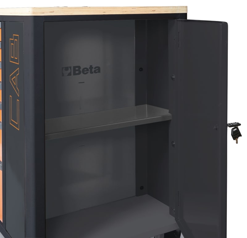 Cassettiera portautensili Beta con 7 cassetti da 588x367 mm, montati su guide telescopiche a sfera: ? 5 cassetti altezza 70 mm ? 1 cassetto altezza 140 mm ? 1 cassetto altezza 210 mm Caratteristiche: ? Piano dei cassetti protetto da tappetini di gomma espansa ? Quattro ruote ? 125 mm di cui 2 fisse e 2 girevoli con freno ? Serratura centralizzata frontale ? Armadietto laterale portaoggetti con anta richiudibile con serratura e ripiano interno regolabile in altezza ? Capacita di carico statico pari a 1.100 kg ? Piano di lavoro in legno multistrato con fori per la collocazione di una morsa (1599F/100 da ordinare separatamente) ? Portacarta integrato ? Doppio portaflaconi posteriore ? Portaflaconi laterale integrato