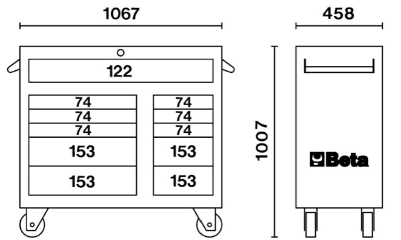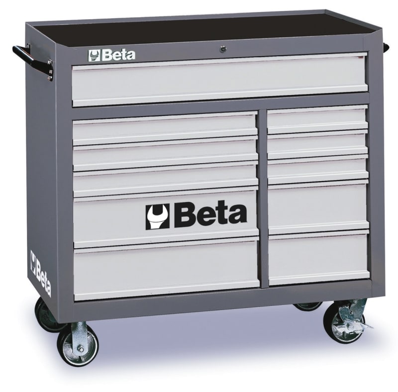 Cassettiera portautensili con 11 cassetti montati su guide telescopiche a sfera: ? 1 cassetto 937x410x122 mm ? 3 cassetti 570x410x74 mm ? 2 cassetti 570x410x153 mm ? 3 cassetti 313x410x74 mm ? 2 cassetti 313x410x153 mm Caratteristiche: ? Piano dei cassetti protetto da tappetini di gomma espansa ? Capacita di carico statico: 1200 kg ? 4 ruote ad alta portata ? 125 mm: 2 fisse e 2 girevoli (entrambe con freno a leva) ? Serratura centralizzata frontale ? Piano di lavoro di lamiera ricoperto da tappetino in gomma ? Possibilita di applicazione del portacarta 2499PC e del portaflaconi 2499PF