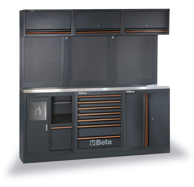 Combinazione composta da: ? Piano di lavoro in MDF rivestito in acciaio inossidabile (C45PX/3-2,0MT) ? Modulo fisso con 7 cassetti (C45PRO M7) ? Modulo fisso di servizio (C45PRO MS) ? Modulo fisso con 2 antine (C45PRO MA) ? 3 pensili a muro (C45PROPM) ? 3 pannelli forati portautensili (C45PRO PF) ? 2 staffe per parete tipo largo (C45PRO SL) ? 2 staffe per parete tipo stretto (C45PRO SS)