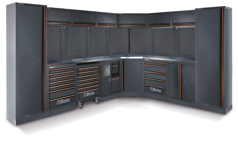 Combinazione composta da: ? 1 piano di lavoro in MDF rivestito in acciaio inossidabile (C45PX/3-2,0MT) ? 1 piano di lavoro in MDF rivestito in acciaio inossidabile (C45PX/2-1,3MT) ? 1 modulo fisso con 7 cassetti (C45PRO M7) ? 1 cassettiera mobile con 7 cassetti (C45PRO C7) ? 1 modulo fisso di servizio (C45PRO MS) ? 1 modulo fisso con 5 cassetti (C45PRO M5) ? 1 modulo fisso con 2 antine (C45PRO MA) ? 1 angolo completo autoportante con piano di lavoro in MDF rivestito in acciaio inossidabile (C45PRO CORNER/X) ? 5 pannelli forati portautensili (C45PRO PF) ? 5 pensili a muro (C45PRO PM) ? 7 staffe per parete tipo largo (C45PRO SL) ? 2 staffe per parete tipo stretto (C45PRO SS) ? 2 armadi a 1 anta (C45PRO AS1)