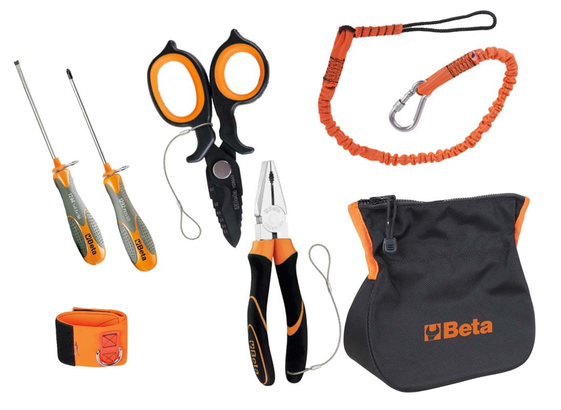Gli utensili e gli accessori anticaduta Beta H-SAFE sono progettati per garantire la massima sicurezza e comodità d’uso nei lavori in altezza. Forbici, pinze e giravite sono collegati, tramite anelli a rotazione libera e cavi di acciaio, a un laccio ammortizzato, fissabile a una cintura o alla comoda polsiera. Tutti gli utensili sono contenuti in una sacca in tessuto resistente dotata di cerniera e di chiusura auto serrante, che evita perdite anche se ribaltata. Set di utensili dotati di sistema Anticaduta, composto da: - 1 pz Forbice H-SAFE BAX - 1 pz Pinza universale H-SAFE da 180mm. - 1 pz Giravite PH1 - 4,5*120 mm. - 1 pz Giravite LPP - 3*75 mm. - 1 pz Giravite LPP - 4*100 mm. - 1 pz Sacca autoserrante da cintura. - 1 pz Elastici 0,8÷1,2 mt + Moschettoni 80 +LACCI. - 1 pz Polsiera a strappo con anello - Portata 2,7 kg.