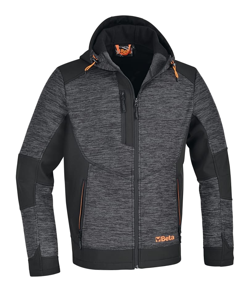 Materiali:? Tessuto principale: fleece 100% poliestere, 250g ? Inserto: softshell 100D con fleece accoppiato, 270 g Caratteristiche:? Chiusura frontale con reversed zip ? Una tasca al petto con chiusura a zip con spirale arancione ? Due profonde tasche in vita con chiusura a zip con spirale arancione ? Cappuccio fisso con regolatori a coulisse ? inserti in tessuto softshell su cappuccio, spalle, gomiti, fianchi e vita Colore:? Pile: grigio melange ? Softshell: nero Taglie:XS, S, M, L, XL, XXL, XXXL