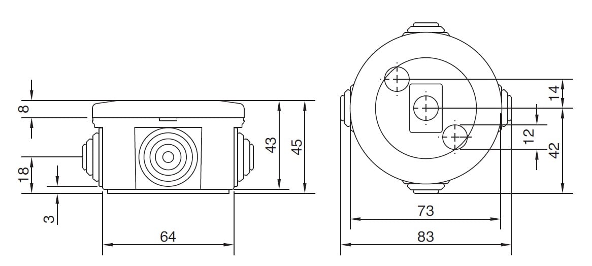 La cassetta di derivazione stagna da parete, di forma rotonda, della linea Pico, con 4 passatubi per tubi rigidi da 16 e 20 mm, è dotata di un pratico sistema di chiusura a scatto. Realizzata in ABS autoestinguente grigio (RAL 7035), offre resistenza ai raggi UV, rendendola ideale per installazioni sia interne che esterne. Le dimensioni sono diametro 65x35 mm, con protezione IP40 e resistenza agli impatti IK07 (EN 62262).