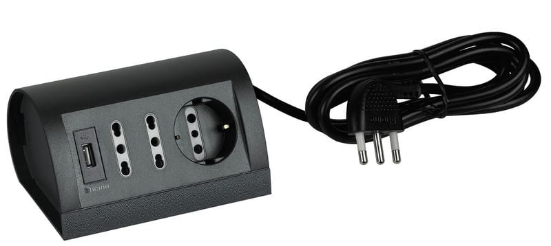 Multipresa da scrivania precablata con 2 prese bipasso 10/16A, una presa tedesca P30 e due prese USB alimentate 5V - 1,5A max, con 2 m di cavo, 250 Va.c. grigia