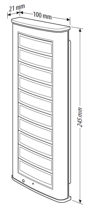 Minisfera modulo pulsanti dotato di dieci pulsanti di chiamata. I collegamenti al modulo fonico vengono effettuati utilizzando il multicavo fornito a corredo. I cartellini portanome sono illuminati da dieci LED verdi