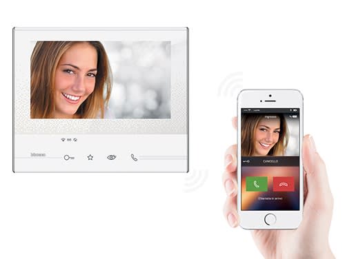 Videocitofono connesso 2 fili / Wi-Fi vivavoce con teleloop, display LCD Touch screen da 7” e segreteria videocitofonica – finitura chiara. E’ dotato di tasti capacitivi per il comando delle principali funzioni videocitofoniche: apertura serratura, connessione vivavoce, attivazione del posto esterno / ciclamento telecamere e tasto preferiti (configurabile per attivare le azioni rapide che l’utente utilizza più frequentemente – es. comando luci scale, intercom, attivazioni aggiuntive). Guida tattile per accesso facilitato ai tasti capacitivi di comando serratura e connessione vivavoce. LED di segnalazione per : esclusione chiamata e presenza messaggi da centralino di portineria e note. Accesso a regolazioni e funzioni tramite display touch. Funzione NOTE – per la scrittura tramite tastiera o registrazione vocale di messaggi e/o appunti per gli altri residenti dell’appartamento (es. chiamare idraulico, fare la spesa ecc.). Possibilità di comunicazione vocale con centralino di portineria – se presente nell’impianto – su specifica chiamata.Il dispositivo deve essere configurato tramite inserimento fisico dei configuratori oppure da menù usufruendo di una maggiore possibilità di personalizzazione di funzioni e testi associati. Inoltre, grazie alla connessione Wi-Fi è possibile associare il videocitofono all’App Door Entry (disponibile per Android e iOS). Dall’App è possibile gestire le principali funzioni del videocitofono (ricezione chiamata, apertura serratura, gestione segreteria videocitofonica, attivazione del posto esterno / ciclamento telecamere e attivazioni aggiuntive).Aperto all\'integrazione con dispositivi connessi di terze parti (es. Telecamere Intelligenti da esterno e da interno NETATMO). L\'App è dotata anche di Assistente Virtuale per la risoluzione rapida delle richieste di assistenza.