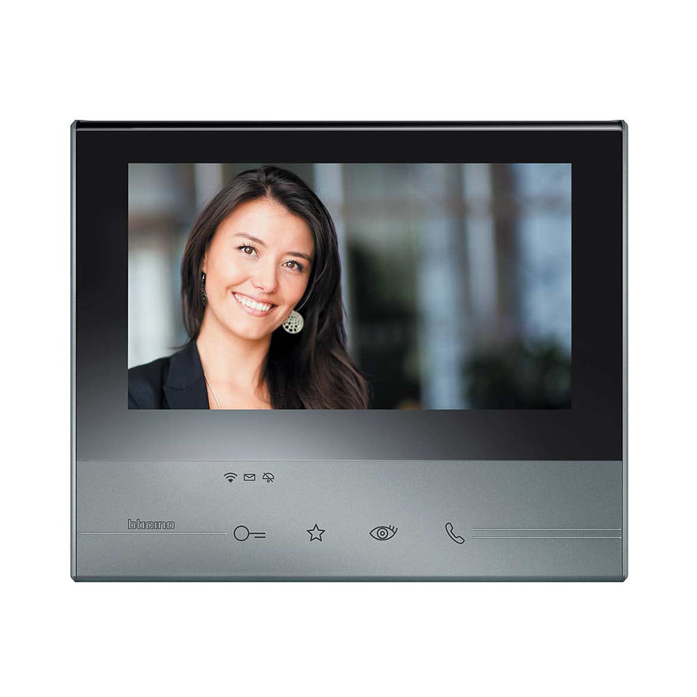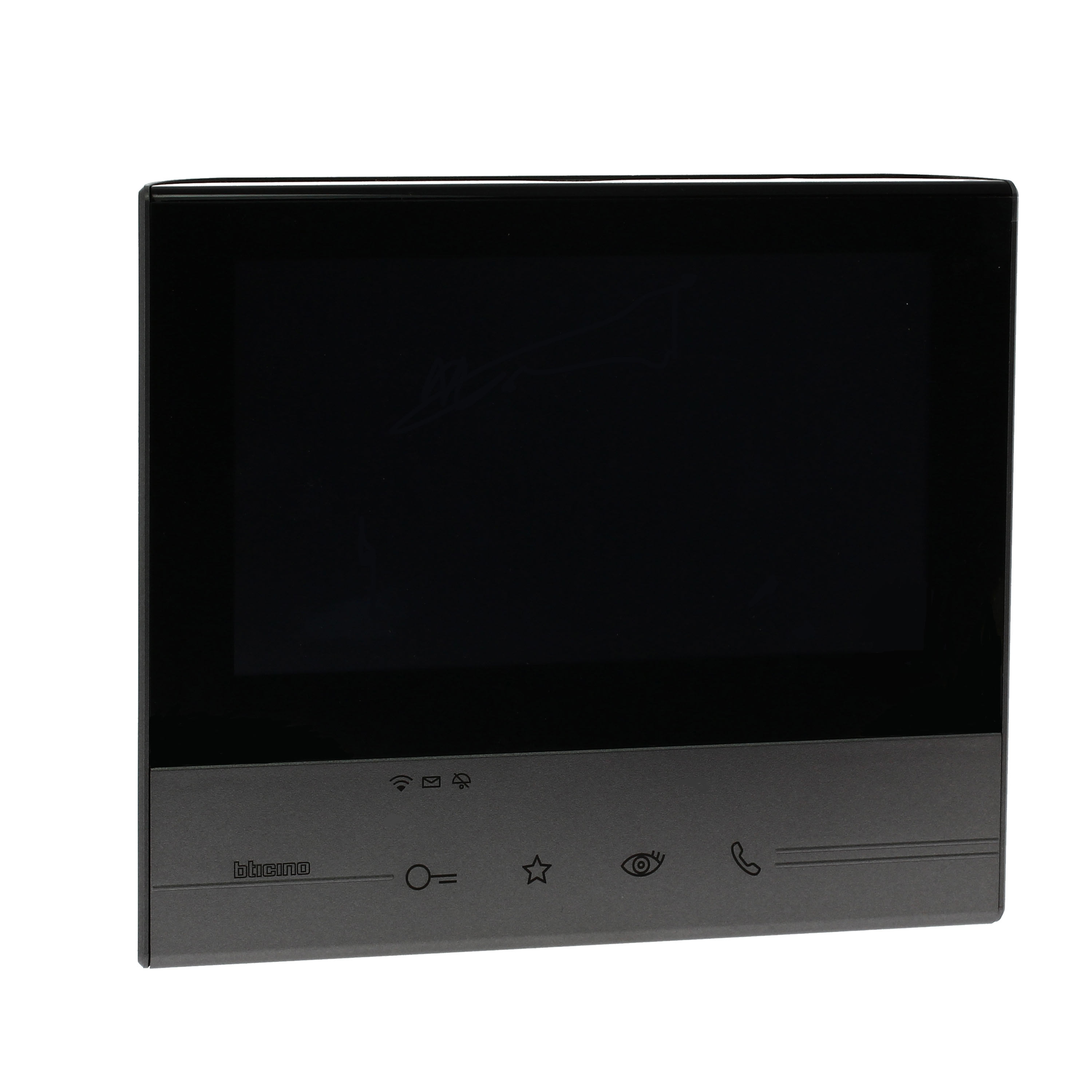 Videocitofono connesso 2 fili / Wi-Fi vivavoce con teleloop, display LCD Touch screen da 7” e segreteria videocitofonica – finitura scura. E’ dotato di tasti capacitivi per il comando delle principali funzioni videocitofoniche: apertura serratura, connessione vivavoce, attivazione del posto esterno / ciclamento telecamere e tasto preferiti (configurabile per attivare le azioni rapide che l’utente utilizza più frequentemente – es. comando luci scale, intercom, attivazioni aggiuntive). Guida tattile per accesso facilitato ai tasti capacitivi di comando serratura e connessione vivavoce. LED di segnalazione per : esclusione chiamata e presenza messaggi da centralino di portineria e note. Accesso a regolazioni e funzioni tramite display touch. Funzione NOTE– per la scrittura tramite tastiera o registrazione vocale di messaggi e/o appunti per gli altri residenti dell’appartamento (es. chiamare idraulico, fare la spesa ecc.). Possibilità di comunicazione vocale con centralino di portineria – se presente nell’impianto – su specifica chiamata.Il dispositivo deve essere configurato tramite inserimento fisico dei configuratori oppure da menù usufruendo di una maggiore possibilità di personalizzazione di funzioni e testi associati. Inoltre, grazie alla connessione Wi-Fi è possibile associare il videocitofono all’App Door Entry (disponibile per Android e iOS). Dall’App è possibile gestire le principali funzioni del videocitofono (ricezione chiamata, apertura serratura, gestione segreteria videocitofonica, attivazione del posto esterno / ciclamento telecamere e attivazioni aggiuntive).Aperto all\'integrazione con dispositivi connessi di terze parti (es. Telecamere Intelligenti da esterno e da interno NETATMO). L\'App è dotata anche di Assistente Virtuale per la risoluzione rapida delle richieste di assistenza.