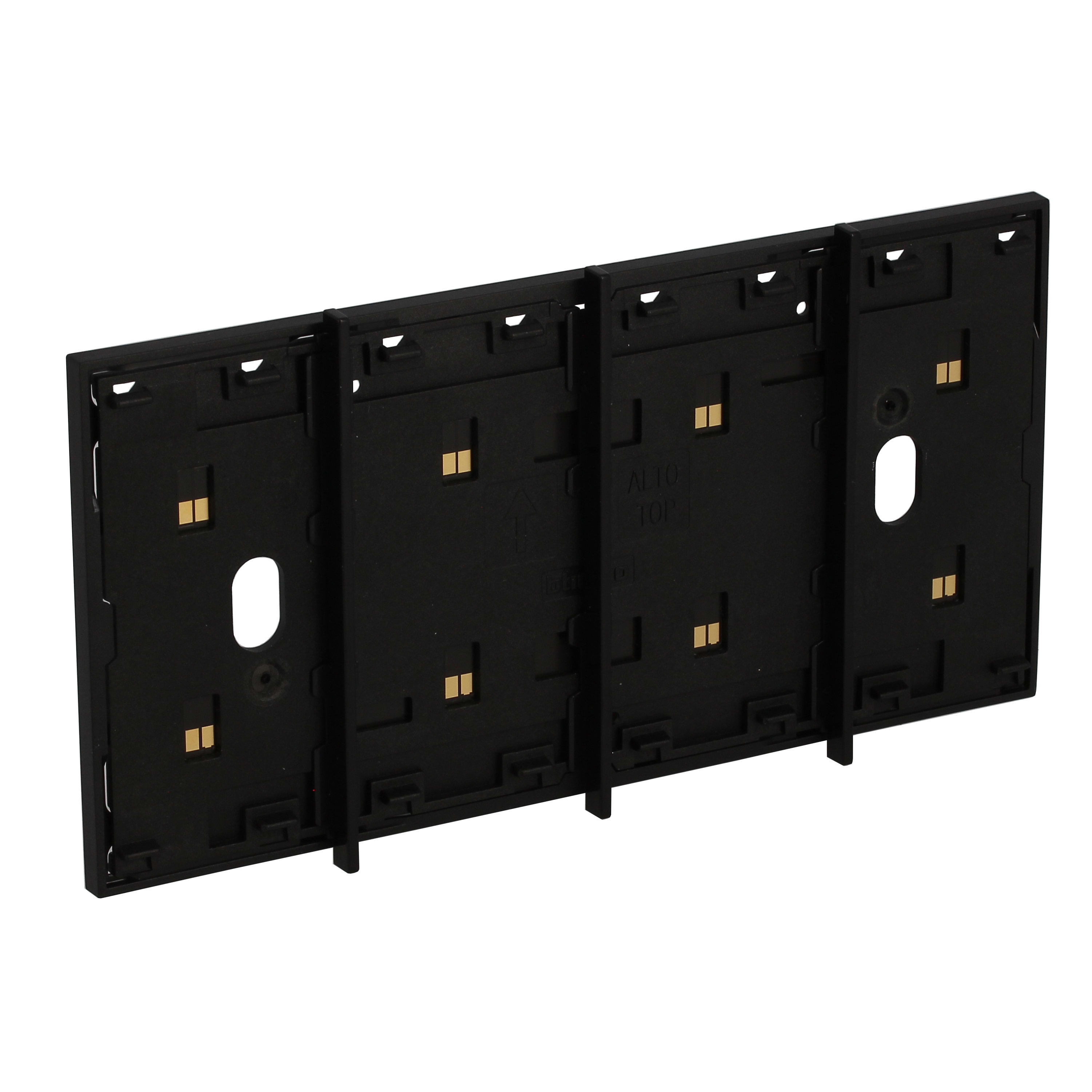 Frame elettrificato con barrette estetiche (rimovibili) di divisione tra i comandi. Per l’installazione di max. 4 comandi digitali o cover art. KW/KG/KM8100. Installazione in scatola da 4 moduli con supporto K4704. Colore nero.
