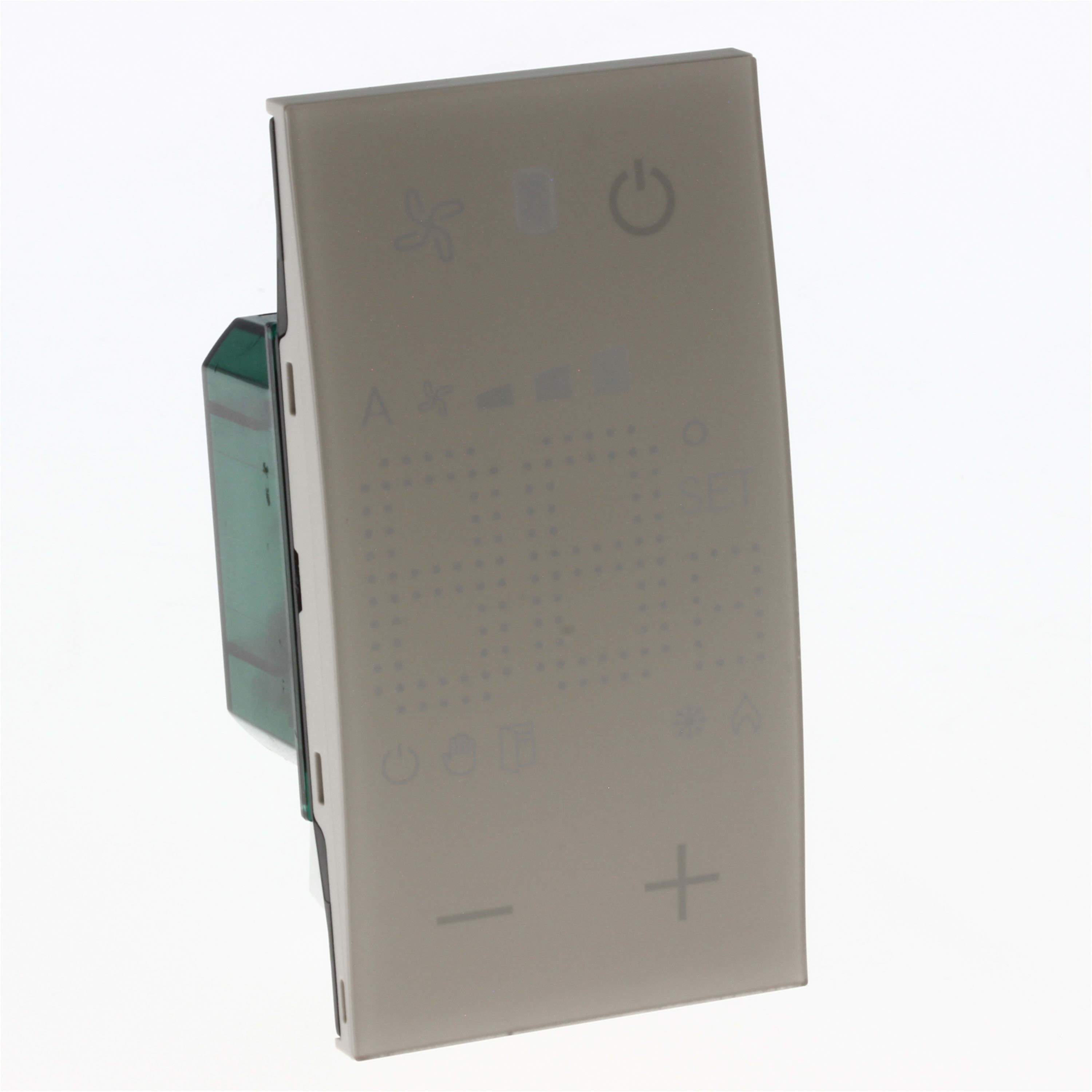 Sonda con display retroilluminato per il controllo della temperatura di una singola zona. È dotato di un ingresso per il collegamento di una linea contatti (es. contatto finestra). Permette la gestione di diverse tipologie di impianto e la regolazione della velocità della ventola in caso di impiego di fan coils. Possibilità di funzionamento automatico (estate/inverno) con impianti compatibili - 2 moduli, sabbia