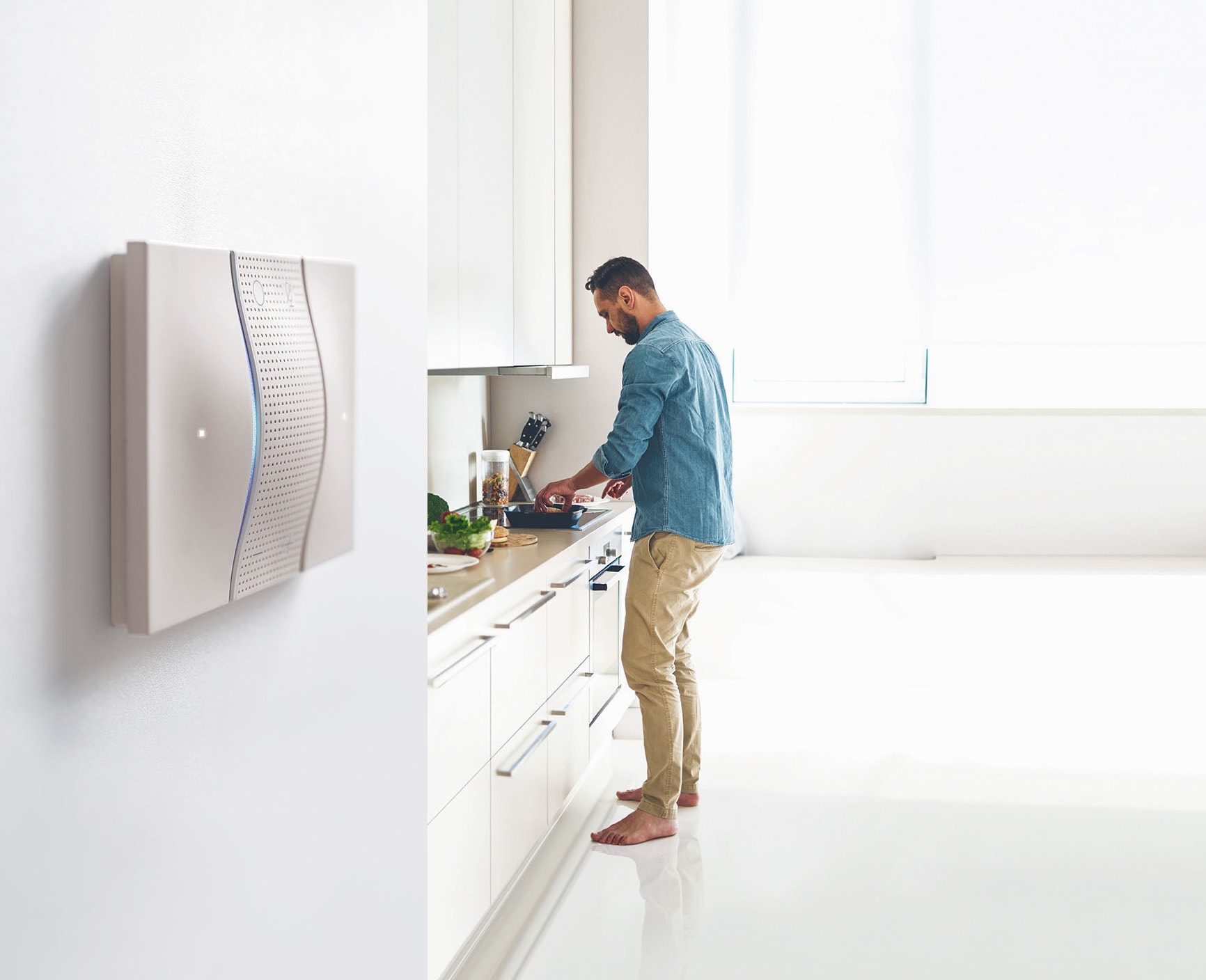 Comando voce. Dispositivo di comando digitale con assistente vocale integrato Amazon Alexa, comprensivo di 2 comandi touch per la gestione delle luci. Associazione tra il dispositivo e la rete WI-Fi di casa, impostazione della lingua di Alexa ecc.. mediante App Digital Controls. Alimentazione a 27V d.c. dal BUS mediante modulo di connessione art. K8001 o eventuale alimentatore supplementare art. K8003 - 3 moduli - colore sabbia.