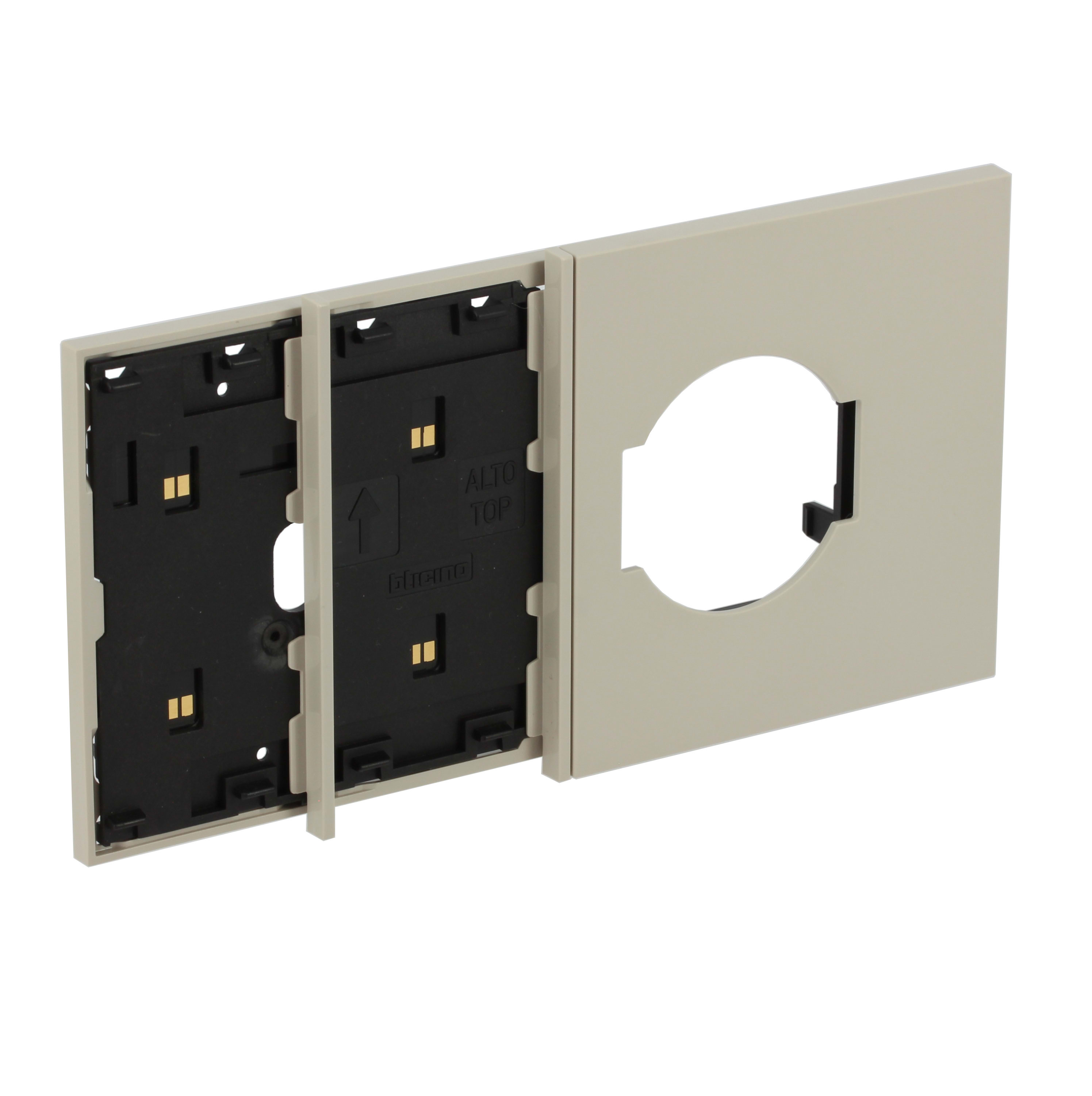 Frame elettrificato con mostrina presa standard italiano e tedesco, per l’installazione di 2 comandi digitali e di una presa 2P+T (articoli compatibili: KM4140A16, KM4140A16F). Installazione in scatola da 4 moduli con supporto K4704. Colore sabbia.