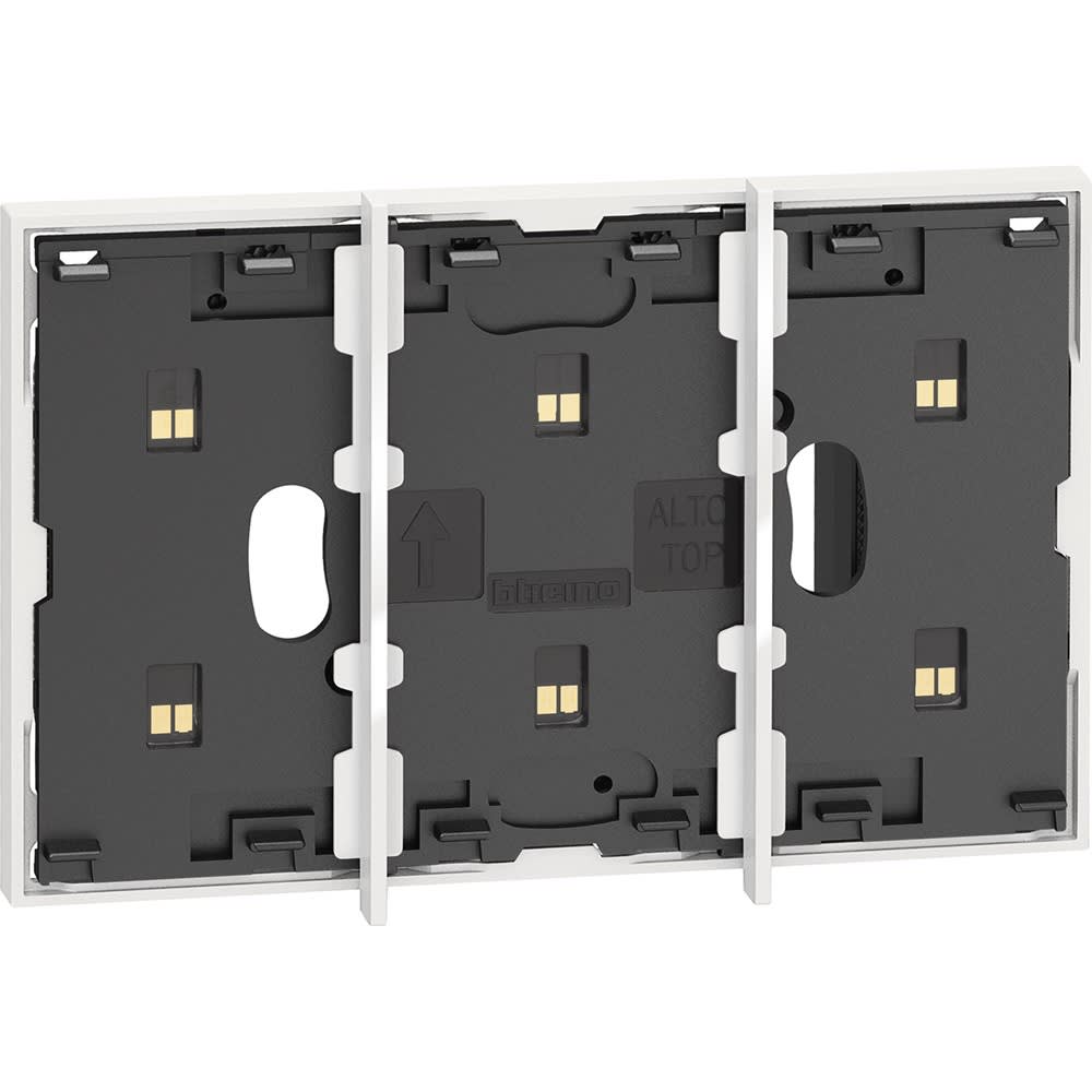 Frame elettrificato con barrette estetiche (rimovibili) di divisione tra i comandi. Per l’installazione di max. 3 comandi digitali o cover art. KW/KG/KM8100 in scatola da 2 moduli con apposito supporto art. K8102. Colore bianco.