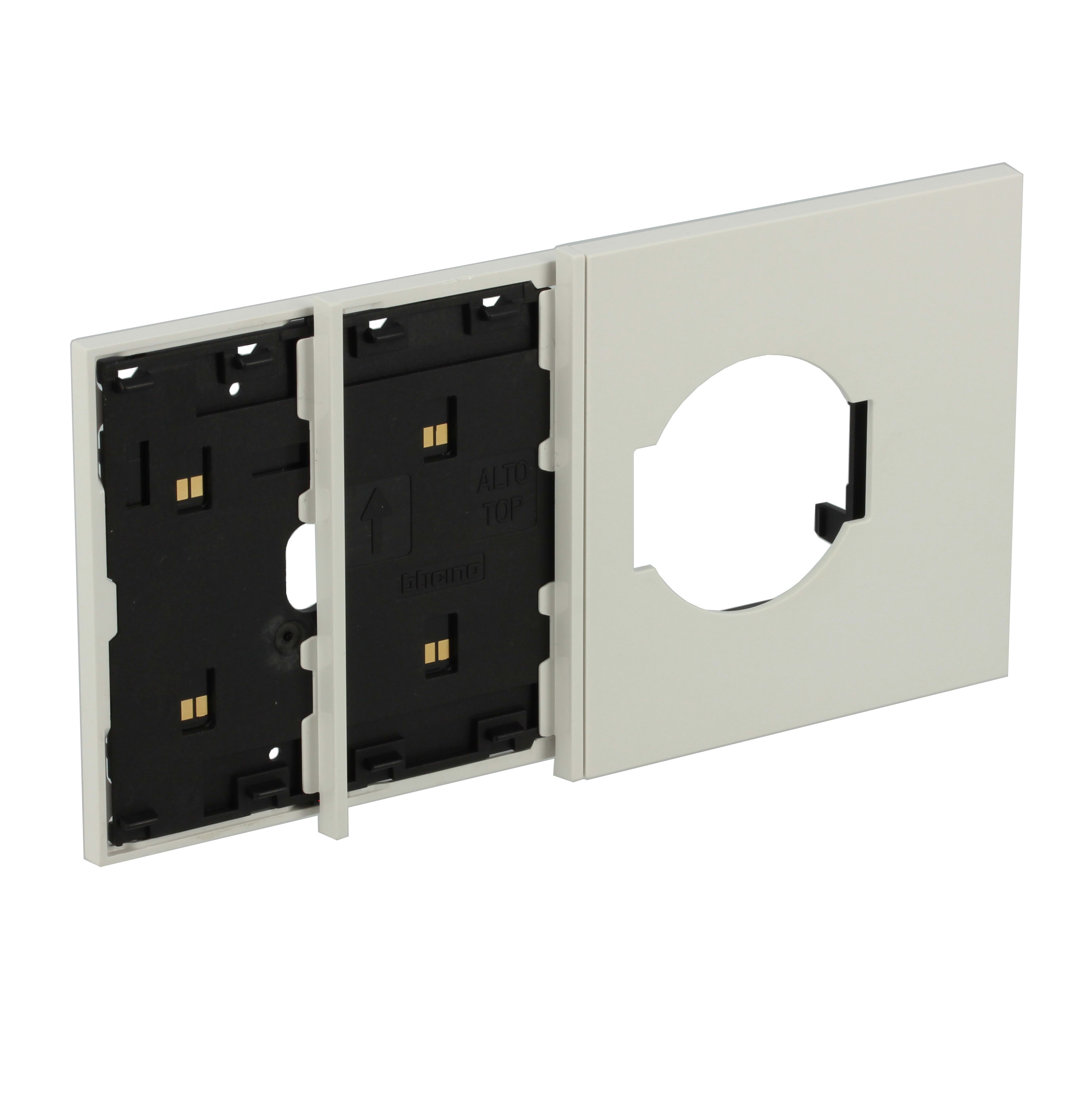 Frame elettrificato con mostrina presa standard italiano e tedesco, per l’installazione di 2 comandi digitali e di una presa 2P+T (articoli compatibili: KW4140A16, KW4140A16F). Installazione in scatola da 4 moduli con supporto K4704. Colore bianco