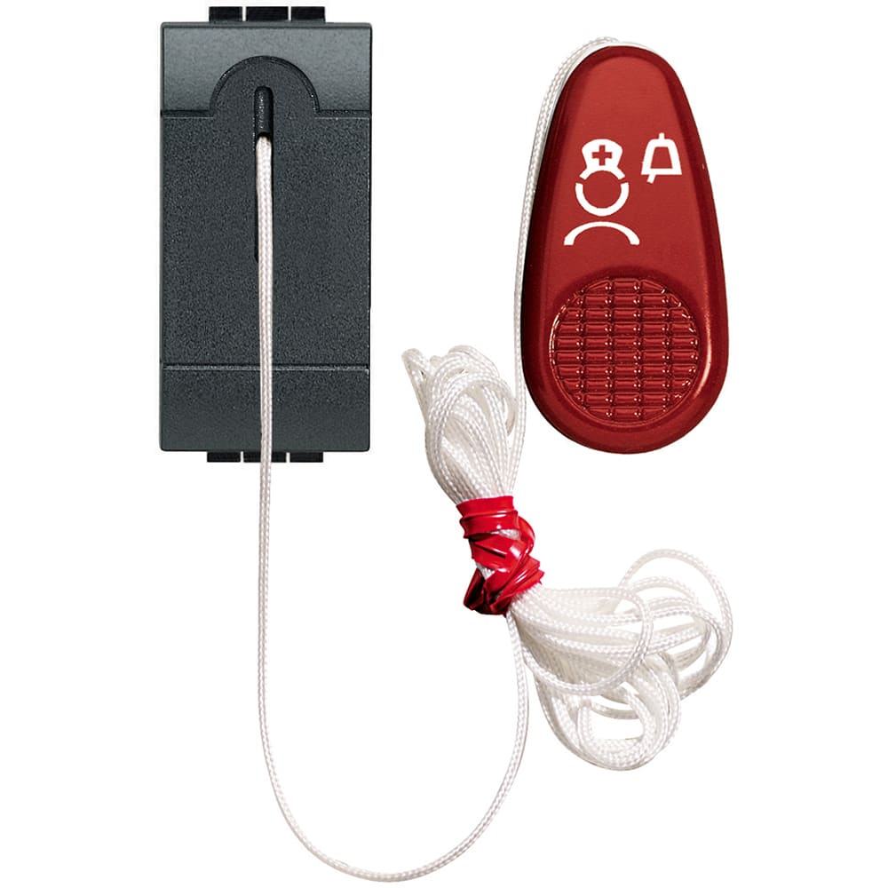 Pulsante a tirante (NC/NO). Da installare nel bagno. Impugnatura di colore rosso con icona infermiera per attivare la richiesta d’assistenza. Deve essere collegato al terminale di camera. Dispositivo 1 modulo - serie civile.