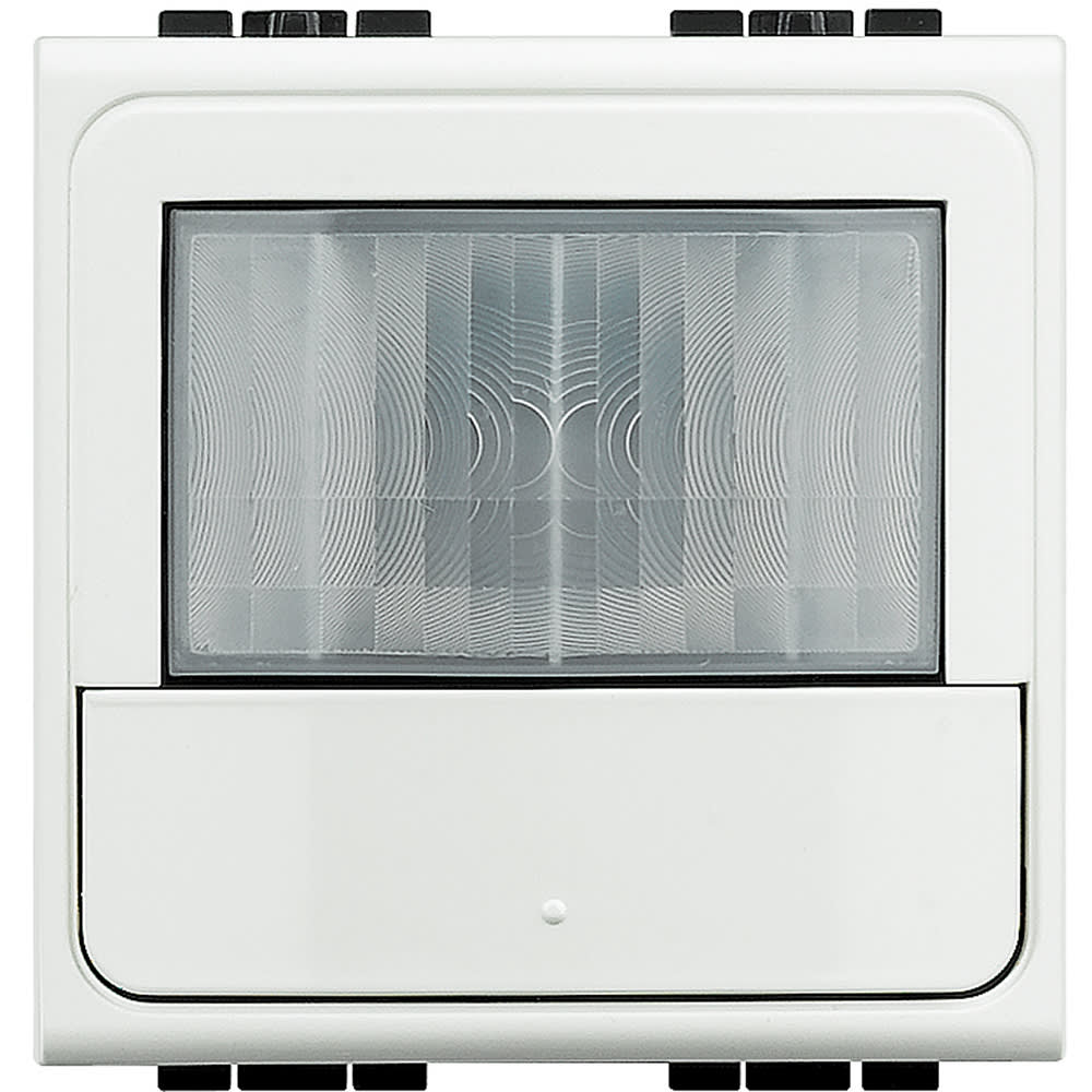 Green Switch: interruttore con sensore di presenza a raggi infrarossi passivi e sensore di luminosità. Accensione manuale della luce tramite pulsante frontale e spegnimento automatico in funzione del livello di luminosità e della presenza. Temporizzazione per ritardo di spegnimento e soglia del sensore di luminosità impostabili tramite potenziometro e telecomando mono/bidirezionale. Alimentazione 230 Vac e uscita relè 1,7 A max - 2 moduli - Bianco