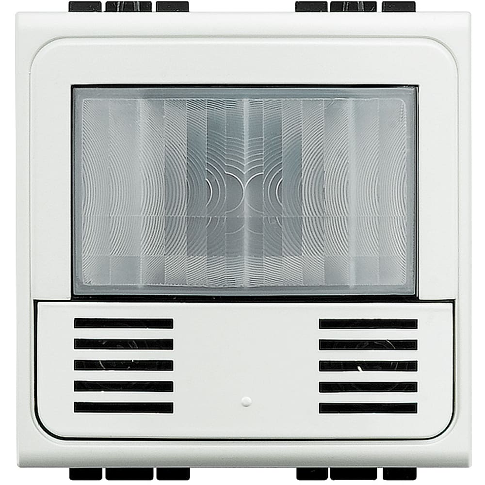 Green Switch: Sensore BUS-SCS a doppia tecnologia: infrarossi passivi (PIR) ed ultrasuoni (US), adatto per il rilevamento della presenza e del livello di illuminamento, installazione ad incasso in serie civile (Axolute, LivingLight o Màtix), dimensioni 2moduli, grado di protezione IP20, connessione tramite connettore SCS, area di copertura frontale di 8m per un ampiezza di 180° ad un’altezza di installazione di 1.2 m, altezza massima di installazione di 1.2 m, alimentazione 27 V d.c., regolazione tramite telecomando base/avanzato (088240 e BMSO4001) o tramite gli appositi software di configurazione, del livello di illuminamento da 5 lux a 1275 lux, del tempo di ritardo da 5 s a 59m e dei principali parametri di funzionamento.