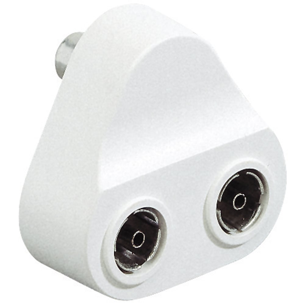 sdoppiatore di antenna TV terrestre - idoneo alla alimentazione equilibrata di 2 televisori - si consiglia l’impiego in presenza di un buon segnale televisivo per compensare la perdita di inserzione - connettori 1 spina e 2 prese diametro 9,5 mm - bianco- prodotto in blister 72x122mm. Formato blister: blister 72x122