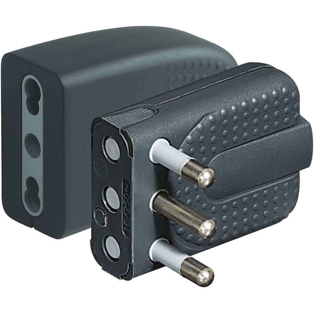 Coppia spina/presa Corner. Spina 2P+T 16A salvaspazio con spinotti orientabili e serracavo autobloccante. Presa 2P+T bipasso 10/16A di colore antracite - in blister 90x122 mm (LxA).