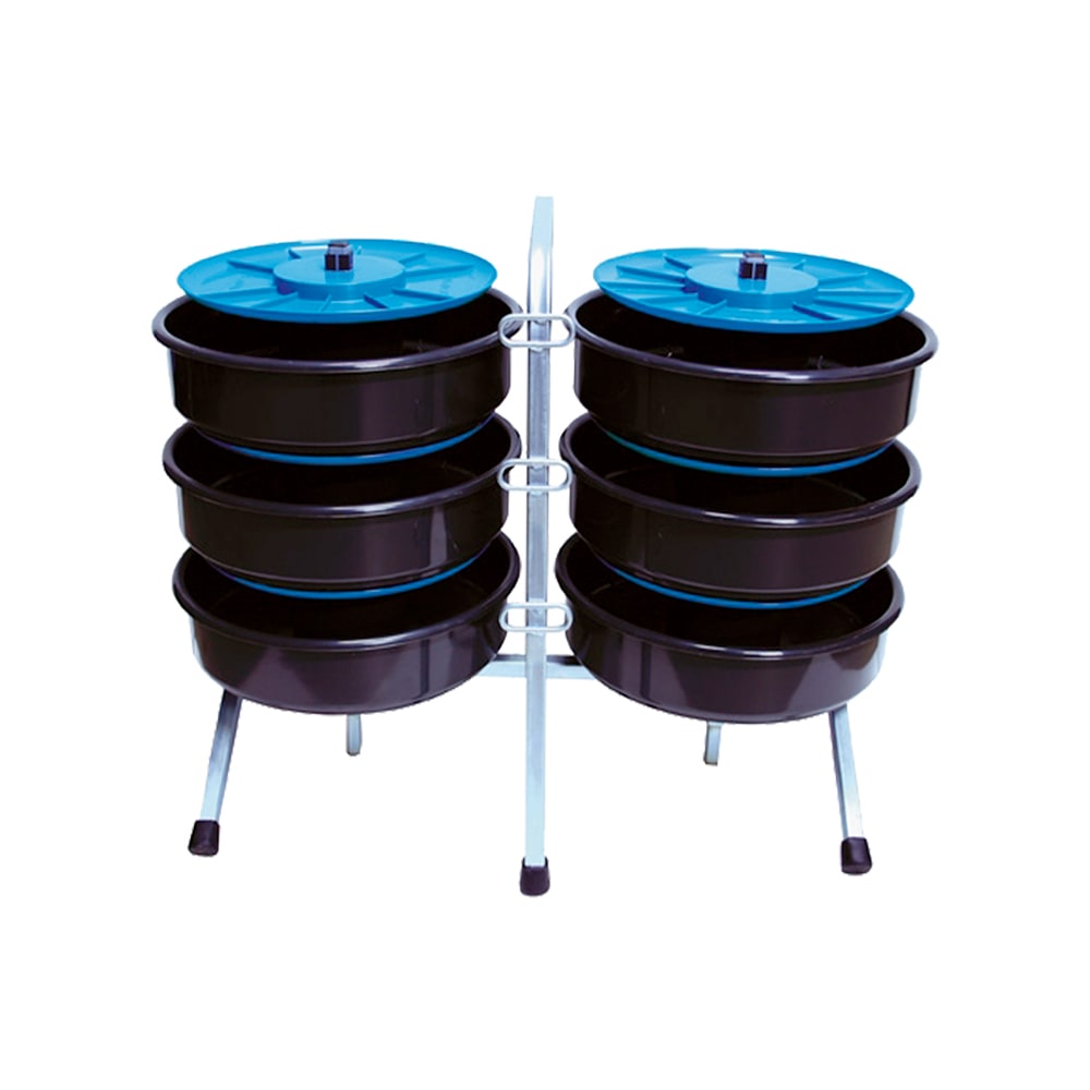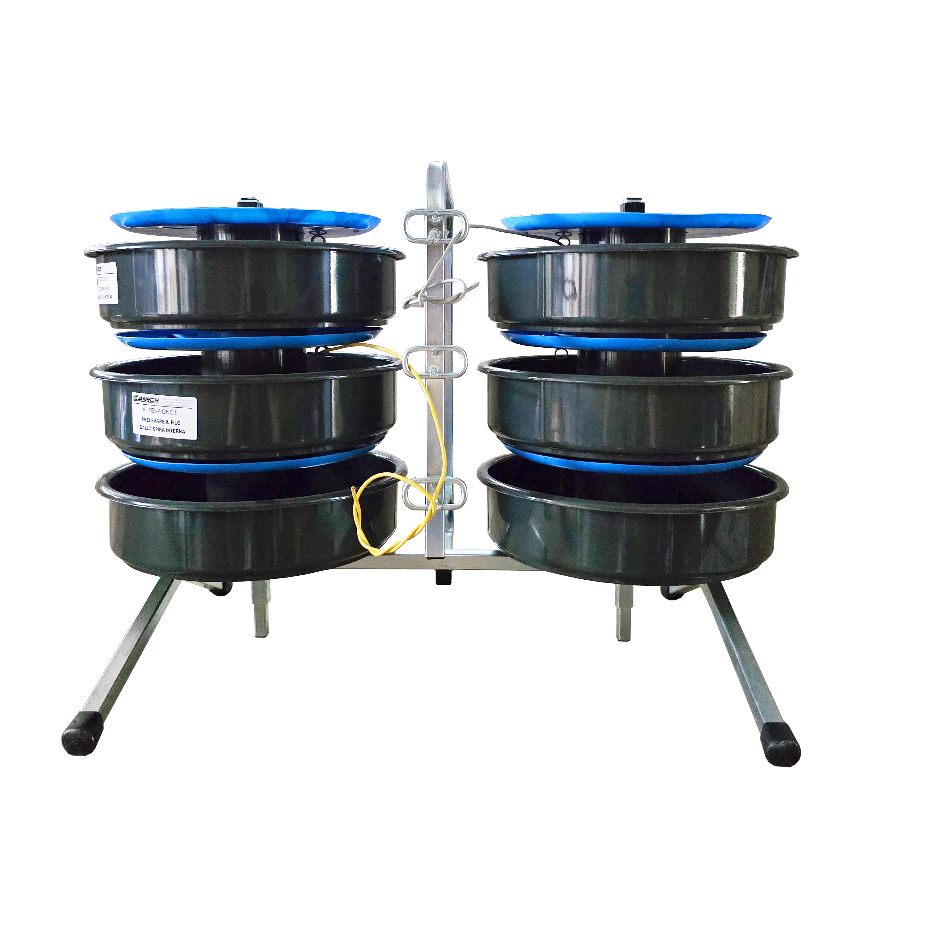 Svolgicavo compatto composto da sei cestelli portamatasse sovrapposti, montati su telaio. Il telaio verticale, realizzato con tubolare Ø 18 mm in acciaio zincato, prevede un manico allungato integrato per il trasporto e tre asole guidafilo. E’ dotato di due alberi laterali portamatasse e di cinque gambe d’appoggio con piedini antisdrucciolo per aumentare la stabilità e la resistenza dello svolgitore al tiro dei fili. I cestelli portamatasse Ø 300 mm realizzati in plastica antiurto consentono il contenimento di matasse standard di filo Ø 290 mm. Ciascun portamatasse è girevole sul proprio supporto e prevede il prelievo del filo dalla spira interna della matassa, il cui capo interno va alloggiato nell’apposita guida fissata sotto il coperchio, mentre il capo esterno va fissato nel foro previsto sul fondo del cestello. Quest’operazione è fondamentale in quanto il filo risulta protetto dalle dannose torsioni che potrebbero aver luogo dallo svolgimento per trazione del filo della matassa. Successivamente, il filo, passando attraverso l’asola guidafi lo prevista sul telaio risulta essere sempre a disposizione dell’operatore. Date le modeste dimensioni, lo svolgicavo può essere comodamente contenuto all’interno del baule di un normale autoveicolo.