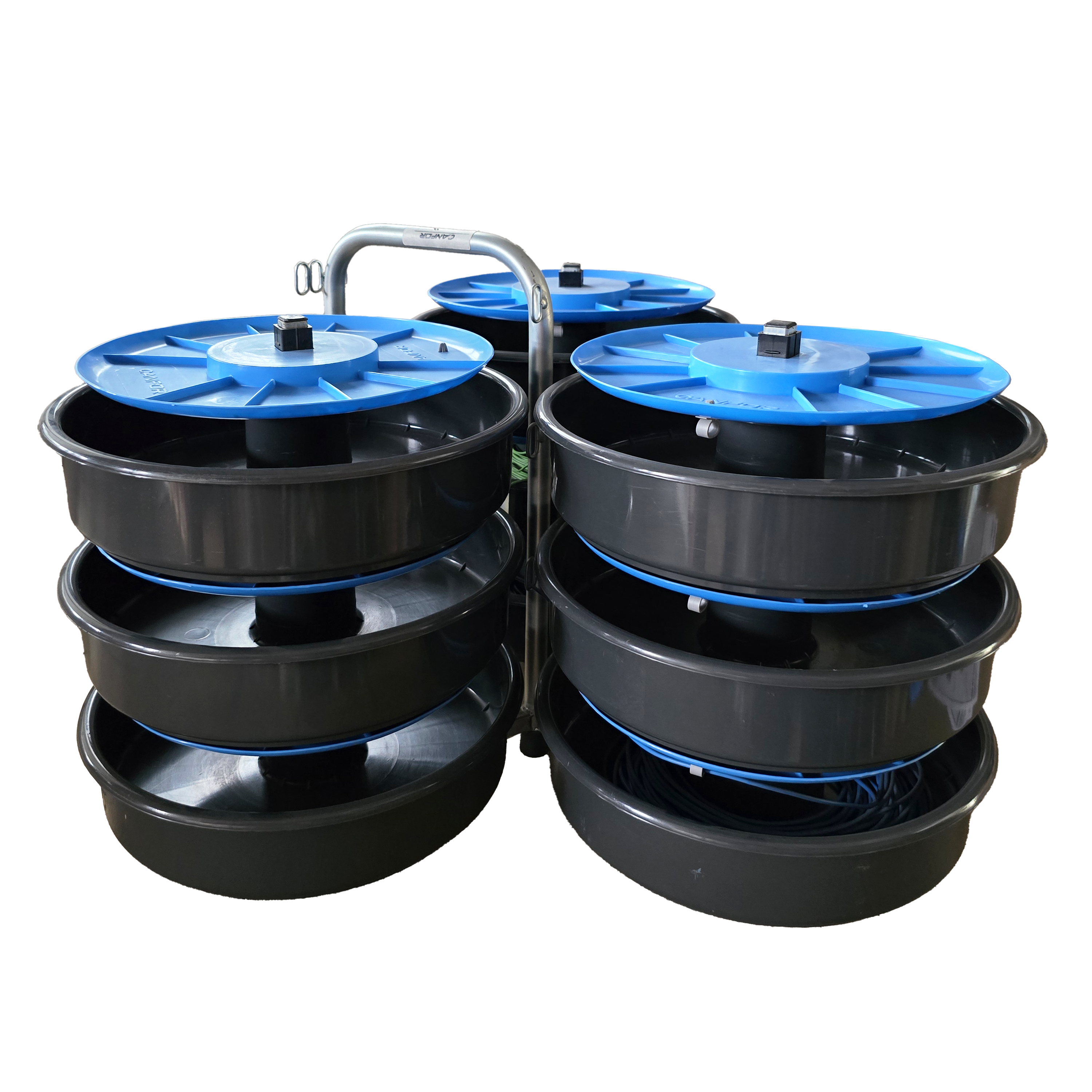 Svolgicavo compatto composto da nove cestelli portamatasse sovrapposti, montati su telaio. Il telaio verticale, realizzato con tubolare Ø 18 mm in acciaio zincato, prevede una struttura allungata per il trasporto con nove asole guidafilo. E’ dotato di tre alberi laterali portamatasse e di gambe d’appoggio con piedini antisdrucciolo per aumentare la stabilità e la resistenza dello svolgitore al tiro dei fili. I cestelli portamatasse Ø 300 mm realizzati in plastica antiurto consentono il contenimento di matasse standard di filo Ø 290 mm. Ciascun portamatasse è girevole sul proprio supporto e prevede il prelievo del filo dalla spira interna della matassa, il cui capo interno va alloggiato nell’apposita guida fissata sotto il coperchio mentre il capo esternova fissato nel foro previsto sul fondo del cestello. Quest’operazione è fondamentale in quanto il filo risulta protetto dalle dannose torsioni che potrebbero aver luogo dallo svolgimento per trazione del filo della matassa. Successivamente, il filo, passando attraverso l’asola guidafilo prevista sul telaio risulta essere sempre a disposizione dell’operatore. Date le modeste dimensioni, lo svolgicavo può essere comodamente contenuto all’interno del baule di un normale autoveicolo.