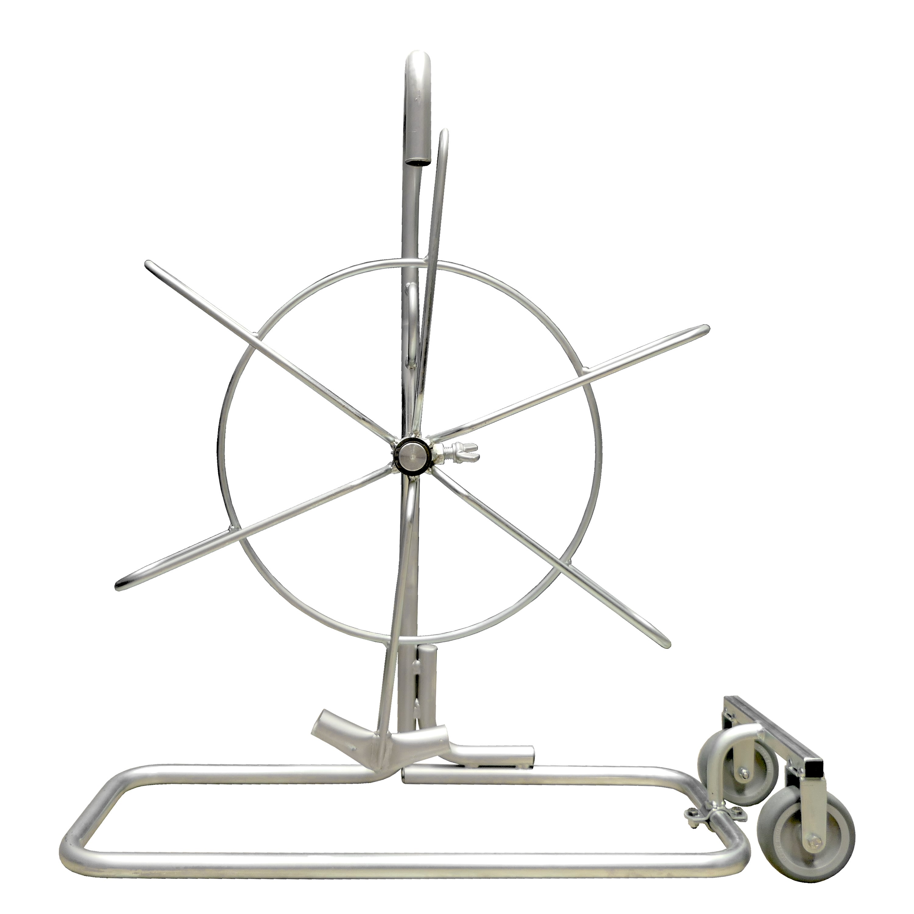 Aspo verticale in acciaio ø 600 mm con ruote. Aspo portasonda su telaio verticale realizzato in tubo d’acciaio ø 20mm zincato dotato di ruote, con pratica impugnatura per il trasporto. Sul telaio verticale è ricavato un anello guidafilo per consentire un facile svolgimento e riavvolgimento della sonda all’interno del cestello. Sul mozzo del telaio è montato il cestello portasonda di ø 600mm rinforzato da 6 raggi disposti ogni 60° per il contenimento di sonde ad elevata rigidità. Sul cestello è presente un doppio fermo dove alloggiare la testa della sonda, per far sì che quest’ultima sia bloccata e permetta l’inserimento ed il riavvolgimento della stessa all’interno dell’aspo. La presenza del doppio fermo garantisce la possibilità di inserire la sonda nell’aspo in entrambe le possibili direzioni. Sul mozzo centrale sono montati sia due grani filettati M5 per l’alloggiamento degli accessori d’uso, forniti in dotazione alle sonde, sia la vite a nasello che consente di bloccare la sonda alla metratura necessaria. L’art. 651/03R è un valido strumento per l’installatore elettricista. La sonda può esser facilmente svolta tramite semplici operazioni. E’ possibile estrarre la sonda fino alla metratura necessaria e poterla bloccare tramite la vite a nasello. Per procedere con il riavvolgimento della sonda, sbloccare la vite e spingere la stessa all’interno del cestello, che di conseguenza si riavvolgerà. Una volta recuperata la sonda all’interno del cestello, bloccarla chiudendo la vite a nasello. I vantaggi dell’aspo sono: facile svolgimento e riavvolgimento della sonda; evita l’aggrovigliamento delle spire della sonda e preserva la stessa da rotture accidentali; mantiene la sonda sempre in ordine e pronta all'uso. Gli alloggi per gli accessori, costituiti da due perni filettati M5 consentono di avere tutti gli strumenti necessari sempre disponibili e a portata d’uso. Adatto per sonde art. : 155 – 163 – 165 per tutte le metrature. Adatto per sonde art. : 157 fino a 50 metri.