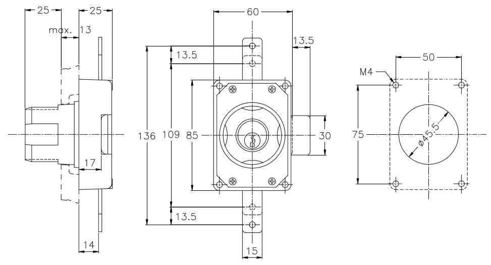 Serratura azionabile con chiave di sicurezza cfr. Y21, con pomolo con rotazione a folle antivandalica in posizione di chiusura. Corredata di chiave, stampata in resina poliammidica rinforzata con fibra di vetro, cilindro/rotore in ottone. Funzionamento tipo cremonese in 3 punti.