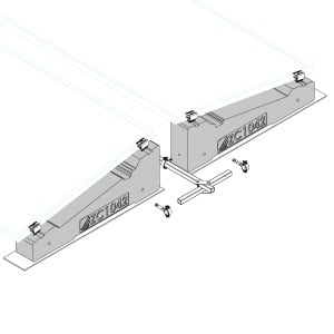 Il sistema con supporto in conglomerato cementizio ZC1042, consente di installare una singola fila di moduli fotovoltaici disposti in orizzontale o verticale con inclinazione 10°. Il montaggio a scatto dei morsetti universali terminale KMTU2950 e centrale KMCU2950 avviene in corrispondenza del lato corto o lato lungo dei moduli. L’utilizzo di accessori quali barre di rinforzo (controvento), piastre (kit staffe incroci controvento) e zavorre aggiuntive, aumentano la stabilità al carico vento ottimizzando l’incidenza di peso strutturale.