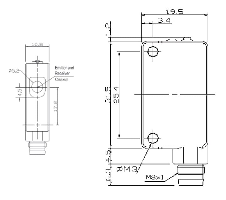 Sensore fotoelettrico in miniatura in standard asiatico. Tasteggio 0,7 m, 150 mm con fascio stretto. Uscita in configurazione standard a 3 fili.
