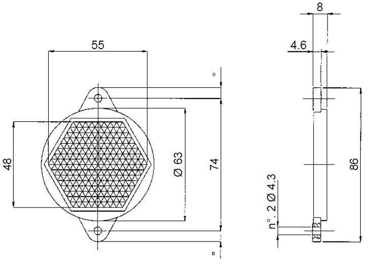 Riflettore prismatico Ø 48 mm con supporto Ø 63 mm.
