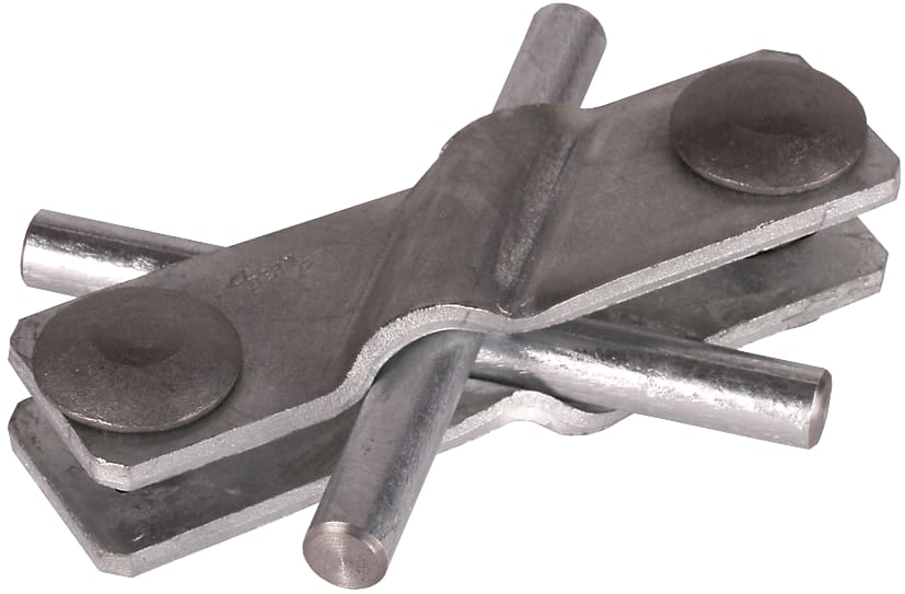 Morsetto di collegamento obliquo secondo CEI EN 62561-1, per collegamenti a croce e a "T" di conduttori tondi e piatti (larghezza fino a 40 mm). Esecuzione con antisvitamento delle viti M10.