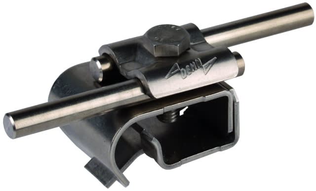 Morsetto per grondaia secondo CEI EN 62561-1, per il collegamento di conduttori tondi al bordo della grondaia. Esecuzione con cavallotto di fissaggio, posa del conduttore longitudinale o trasversale.
