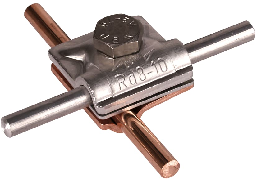Morsetto di collegamento multiuso bimetallico secondo CEI EN 62561-1, per l'applicazione universale per connessioni a croce, a "T" e parallele di conduttori tondi. Esecuzione a tre componenti con vite a testa esagonale e filetto nella parte inferiore.