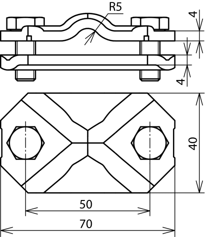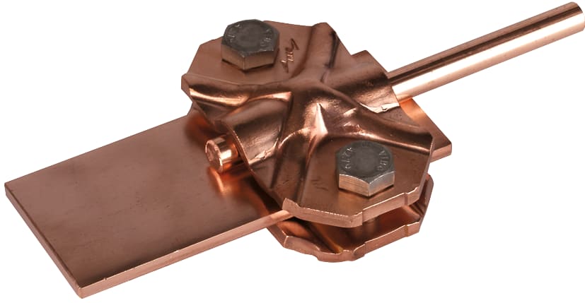 Morsetto di collegamento/sezionamento secondo CEI EN 62561-1 per il collegamento della calata con l'adduzione a terra. Esecuzione a due componenti per conduttori tondi e piatti (larghezza fino a 40 mm).