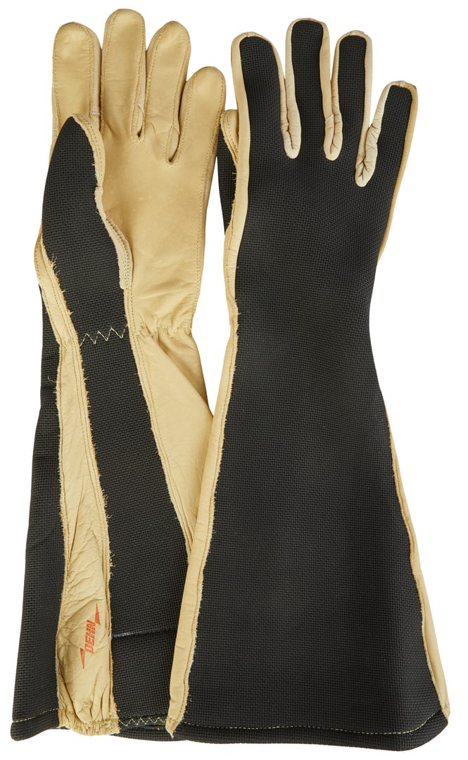 Guanti di protezione a prova di arco elettrico DEHNcare APG con polso allungato per lavori di manutenzione e riparazione su impianti elettrici. Certificazione secondo i requisiti del Regolamento DPI (UE) 2016/425 relativo alla commercializzazione di dispositivi di protezione individuale. Buona sensibilita fine attraverso il rivestimento in pelle morbida all?interno del guanto. Elevato comfort grazie all?impiego di materiali traspiranti. Box-Test secondo la norma IEC 61482-1-2: (classe 2) 423 kJ / m2 e ATPV-Test secondo IEC 61482-1-1: 32,8 cal / cm2. Taglia 10.