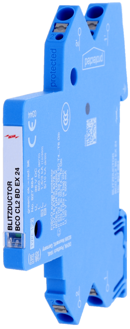 Limitatore di sovratensioni compatto, in esecuzione stretta da 6 mm e connessione Push-in con indicazione di funzionamento per la protezione di 1 coppia di fili di circuiti di misura a sicurezza intrinseca e di sistemi bus. Adempie i requisiti secondo FISCO. Resistenza all'isolamento >500 V filo-terra.