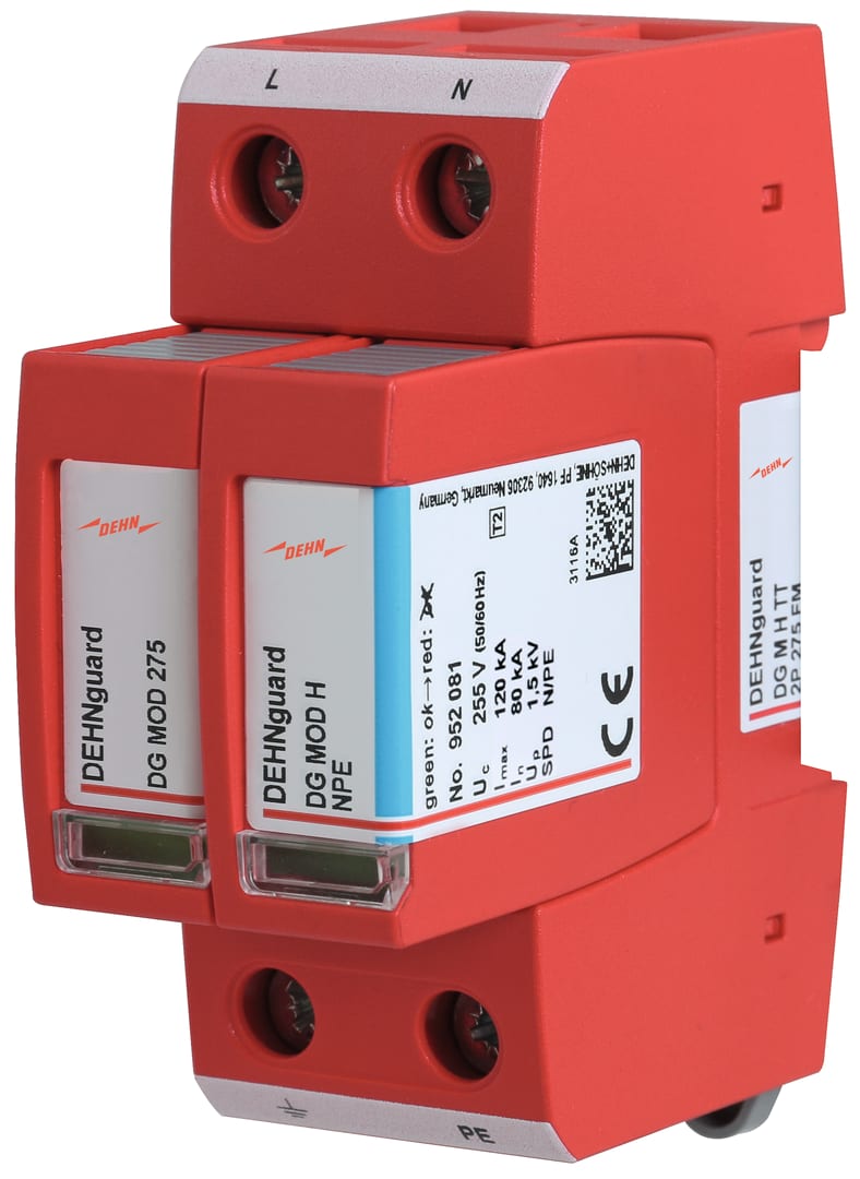 Limitatore di sovratensione multipolare, DEHNguard M, Tipo 2 secondo EN 61643-11, avec haute capacite d'ecoulement consiste in un elemento base e moduli di protezione innestabili. Elevata sicurezza tramite dispositivo di controllo "Thermo- Dynamik-Control". Per la protezione da sovratensioni di impianti elettrici utilizzatori in bassa tensione. Per l'impiego nel concetto di protezione da fulminazione a zone, ai passaggi 0B ? 1 e maggiori.
