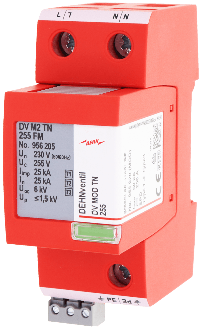 Scaricatore combinato multipolare DEHNventil modular, SPD Tipo 1 + Tipo 2 + Tipo 3 in accordo a EN 61643-11 (CEI EN 61643-11, CEI 37-8) su base spinterometrica, composto da elemento base e un modulo di protezione innestabile.Elevatissima continuita di servizio tramite spinterometri Rapid Arc Control (RAC). Permette la protezione di utenze finali. Per la protezione da sovratensioni di impianti elettrici utilizzatori in bassa tensione, anche in caso di fulminazione diretta. Per l'impiego nel concetto di protezione da fulminazione a zone, ai passaggi 0A - 2.