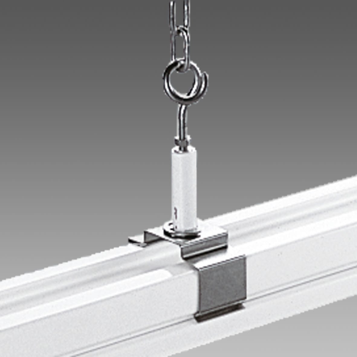 In acciaio. Per la sospensione con catena. Completo di attacco al canale acc. 6051. Utilizzarne almeno 2 per canale. Carico max 30 Kg.