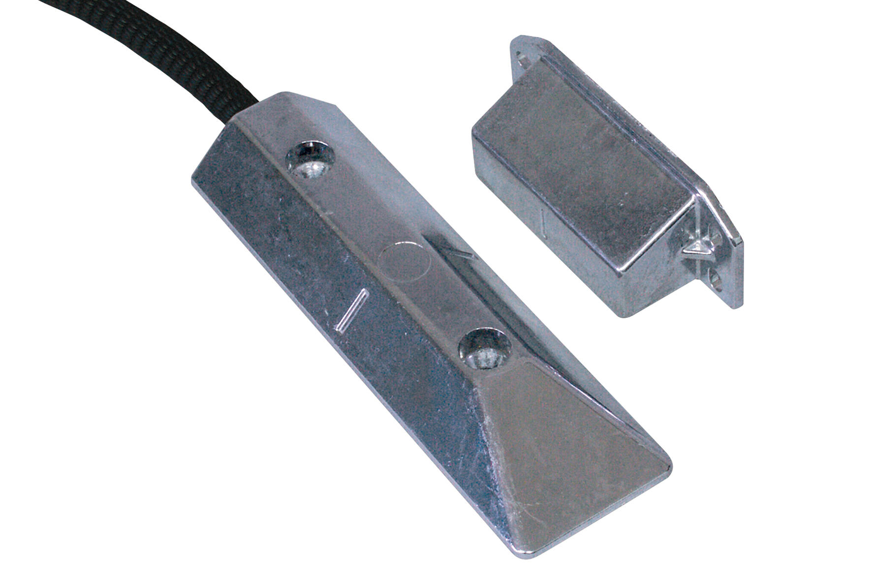 Contatto magnetico per porte basculanti. Fissaggio a pavimento. In alluminio pressofuso. Con loop filo antimanomissione (tamper). Con guaina protezione cavo.
