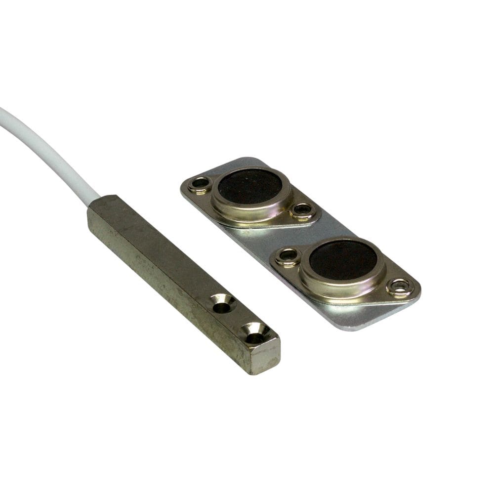 Contatto magnetico a spessore ridotto. Adatto per il montaggio su infissi di qualsiasi materiale: alluminio, legno, PVC, ferro, ecc.Il ridotto spessore del corpo magnete lo rende particolarmente indicato per il fissaggio su serramenti avvolgibili (tapparelle, saracinesche). La parte reed contiene una ampolla incapsulata ermeticamente con resina poliuretanica insieme ad un loop di tamper per ridurre le possibilità di effrazione. La connessione è a 4 fili (2 fili contatto NC con magnete vicino e 2 fili per tamper). Si fissa al serramento con viti.