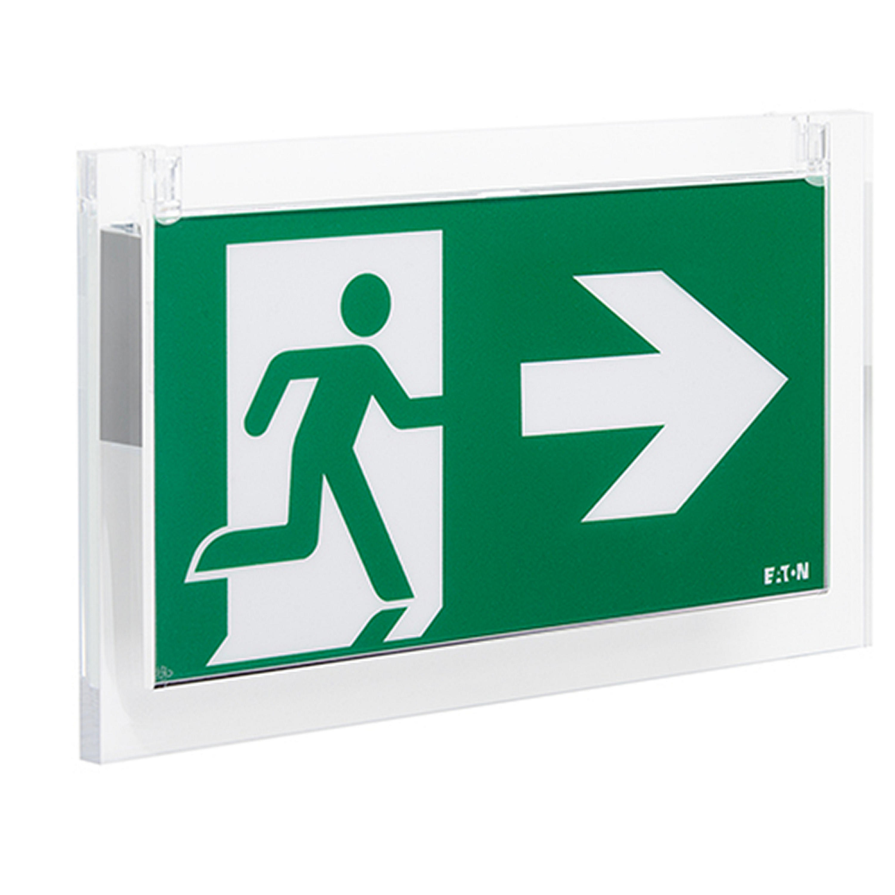 Apparecchio di illuminazione di emergenza a LED Eaton modello CrystalWay, distanza di visibilità 20m, codice LUM22216, lampada con luminanza 500/50cd.\nLampada di emergenza con ottica simmetrica avente grado di protezione IP42, resistenza agli urti IK04,alimentazione 220/240V-50/60Hz, certificazione ENEC, dimensioni 231x133x7.5mm.\nAccessori per l'installazione (opzionali non inclusi): kit di sospensione con cavo, scatola da incasso su controsoffitto, scatola da incasso su controsoffitto con copertura, scatola da incasso a parete per cemento, scatola con ingresso cavi, copertura in acciaio inossidabile.