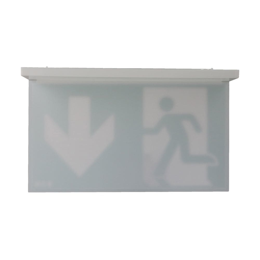 Pannello di segnalazione bifacciale opale doppia funzione ad alta uniformità Eaton da abbinare ad apparecchi NexiTech, modello NEXI-PLEXO-DB, per indicazione basso-cieco, distanza di visibilità 30m, grado di protezione IP40.