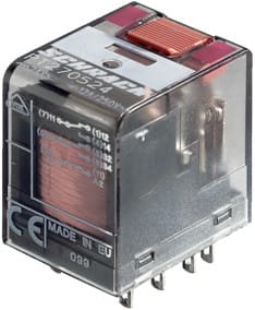 RELÉ MINIATURA DI POTENZA 2 CONTATTI C/O (IN SCAMBIO) 12A SERIE PT. Con tasto di prova e indicatore. CORR. MAX CONT.:12 A. TENS. MAX CONT.:250 V. TEMPO ECCITAZ.:15 mS. TEMPO DISECCIT.:10 mS. ISOLAMENTO :2,5 KV. TEMP. LAVORO :-40°C ÷ +70°C. ZOCCOLO DIN:93/6812. MOLLA:93/6868.