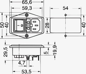 SPINA TRIPOLARE C14 CON PORTAFUSIBILE ED INTERRUTTORE A BILANCERE. FISSAGGIO:fori laterali. 0PORTATA:10 A - 250 V. CORPO:bachelite. CONTATTI:ottone nichelato. FISSAGGIO CAVO:faston 4.8. PER PRESE:13/847. CAVI:6/298.
