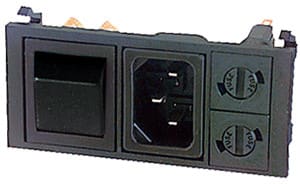 SPINA TRIPOLARE C14 CON DOPPIO PORTAFUSIBILE ED INTERRUTTORE BIPOLARE A BILANCIERE. FISSAGGIO:autobloccante. PORTATA:10 A - 250 V. CORPO:bachelite. CONTATTI:ottone nichel.. FISSAGGIO CAVO:faston 6,35. PER PRESE:13/845. CAVI:6/300.