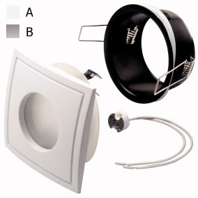 GHIERA QUADRA IP44 BIANCA CON CONNESSIONE GU5,3. Ghiera portalampada quadrata professionale da incasso in alluminio con vetro e guaina di protezione. Fissaggio della lampada ad incastro. Adatto per installazioni tradizionali e in ambienti soggetti ad umidità o spruzzi d’acqua. Fornita con cavetto connessione GU5,3. Utilizzabile anche per lampade GU10 previo utilizzo del connettore 19/6992 non in dotazionePotenza max installabile: 50w. Foro incasso: 77mm. Finit.: SPAZZOLATA.