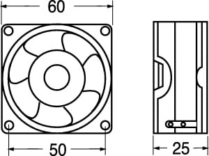 VENTILATORE ASSIALE SUPPORTO BRONZINE 60x60x25 mm.• ELICA: poliestere termopl. •TEMP. LAV.: -10°C÷+70°C •FATT. RUMORE: 30 dB •GIRI MIN./RPM: 4000 •CFM: 20