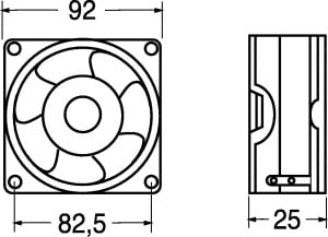 VENTILATORE ASSIALE SUPPORTO BRONZINE 92x92x25.4 mm.• ELICA: poliestere termopl. •TEMP. LAV.: -10°C÷+70°C •FATT. RUMORE: 35 dB •GIRI MIN./RPM: 2800 •CFM: 30÷36