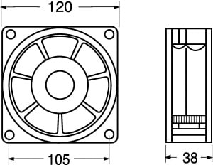 VENTILATORE ASSIALE SUPPORTO BRONZINE 120x120x38 mm. Fornito in confezione industriale. ELICA:poliestere termopl. TEMP. LAV.:-10°C÷+70°C. FATT. RUMORE:42 dB. GIRI MIN./RPM:3000. CFM:105. GRIGLIA:45/9655.